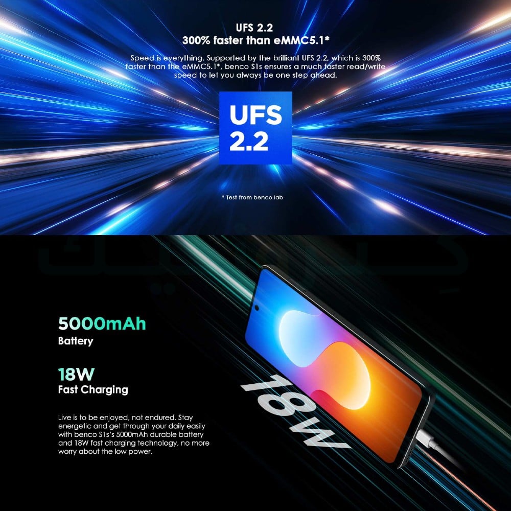 السرعة هي كل شيء. بدعم من UFS 2.2 الرائع، وهو أسرع بنسبة 300% من eMMC5.1*، يضمن benco S1s سرعة قراءة/كتابة أسرع بكثير لتمكنك دائمًا من التقدم بخطوة واحدة.