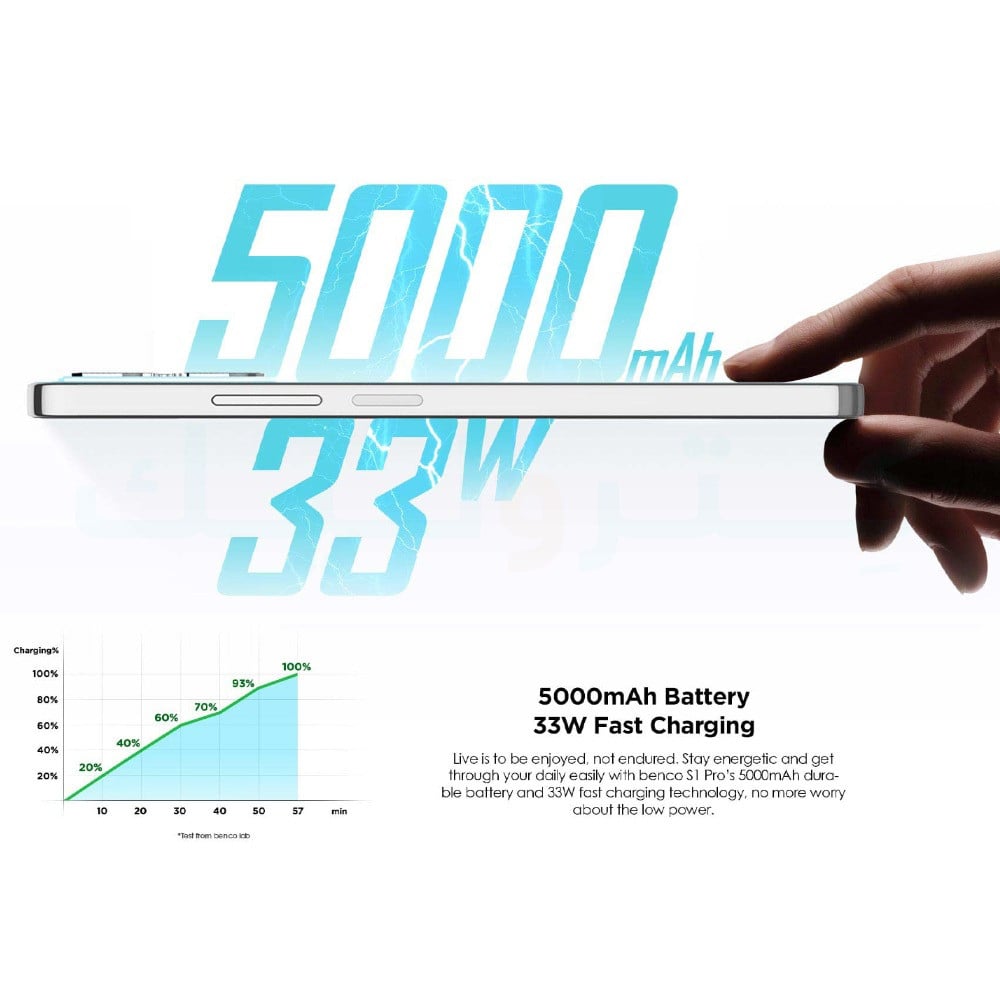 قم بإنجاز مهامك اليومية بسهولة مع بطارية benco S1 PRO المتينة التي تبلغ 5000 مللي أمبير في الساعة وتقنية الشحن السريع 33 وات ، فلا داعي للقلق بشأن الطاقة المنخفضة.